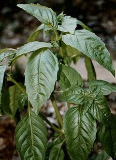 Basil (Ocimum basilicum) of the Family Lamiaceae is also known as Albahaca, St. Joseph's Wort, and Sweet Basil. It is a tender low-growing annual herb, originally native to tropical Asia. It tastes somewhat like cloves, with a strong, pungent, sweet smell. Basil is very sensitive to cold, with best growth in hot, dry conditions.